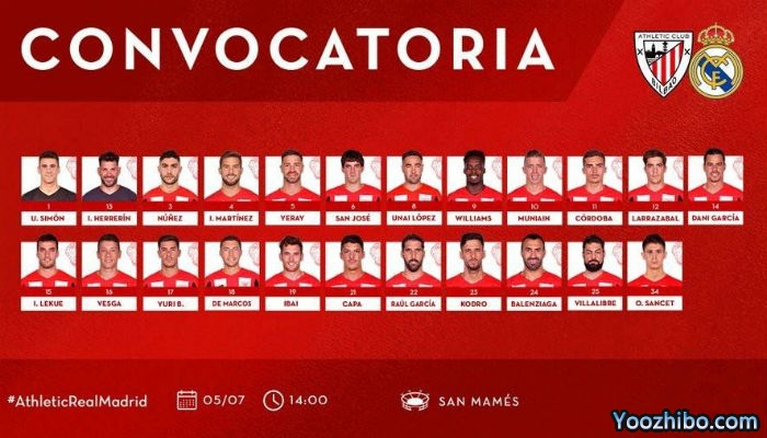 北京时间7月5日凌晨24直播网讯,西甲第34轮,毕尔巴鄂竞技主场迎接皇马挑战,毕尔巴鄂竞技官方公布了出战周日主场与皇家马德里的西甲联赛的大名单。