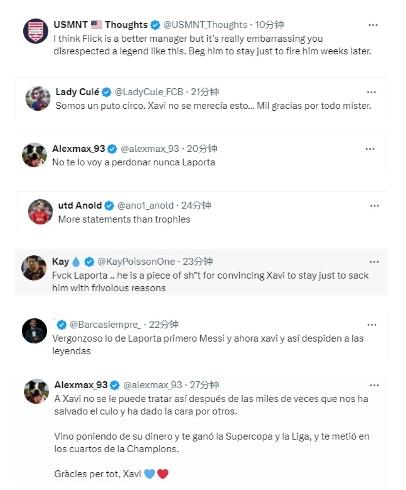不出意外,拉波尔塔和巴萨高层背信弃义解雇哈维的行为,遭到了球迷的炮轰。巴萨球迷攻陷俱乐部的官推,怒喷拉波尔塔:“拉波尔塔的所作所为令人汗颜,先是羞辱梅西,现在又是哈维,传奇人物都是这样被解雇的!”:“拉波尔塔,说服哈维留下只是为了以无聊的理由解雇他,他真是个混蛋!”:“我永远不会原谅你,拉波尔塔!”
