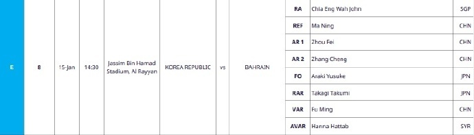 附:亚洲杯韩国VS巴林的裁判安排