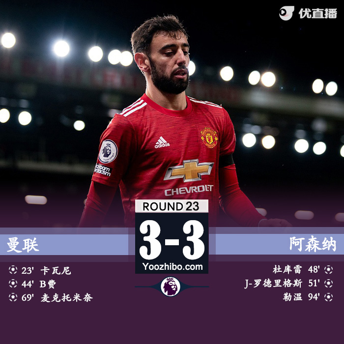 24直播网2月7日讯 北京时间今天4:00,英超联赛第23轮曼联在老特拉福德迎战埃弗顿的比赛准时开始。上半场拉什福德助攻卡瓦尼破门,博格巴伤退,B费进球,半场曼联两球领先。下半场回来杜库雷传射,J罗进球,麦克托米奈头球,终场补射阶段勒温垫射绝平。最终曼联3-3战平埃弗顿。