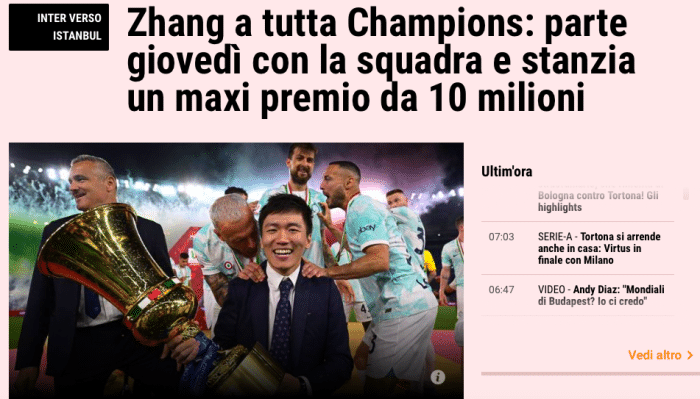 意媒透露,欧冠决赛张康阳将肯定会与球队一起,前往举办地伊斯坦布尔,并且竭尽全力帮助国米处于最佳争冠状态。而为了进一步激发国米球员的争冠动力,张康阳将会额外提供500万欧的夺冠团队奖金,而这笔奖金,将只在球员中分配,不包括小因扎吉和他的教练组。