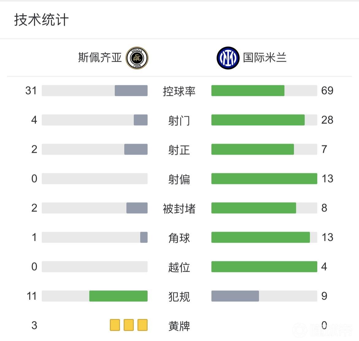 最终国米客场爆冷1-2不敌斯佩齐亚,国米遭遇联赛客场两连败。