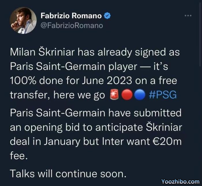 另外巴黎对于在冬窗签下什克也呈开放态度,但是国米的要价为2000万欧元,谈判仍然在继续。