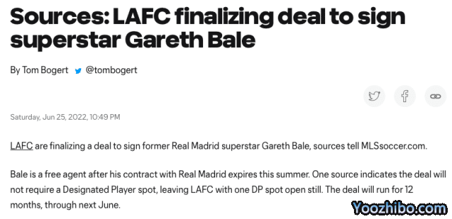 此前,贝尔与故乡球队卡迪夫城队联系在一起。但最终,他还是选择离开欧洲联赛转战美职联。据悉,贝尔将与洛杉矶FC签约一年,直至明年6月,合同还附带延长18个月的选项。