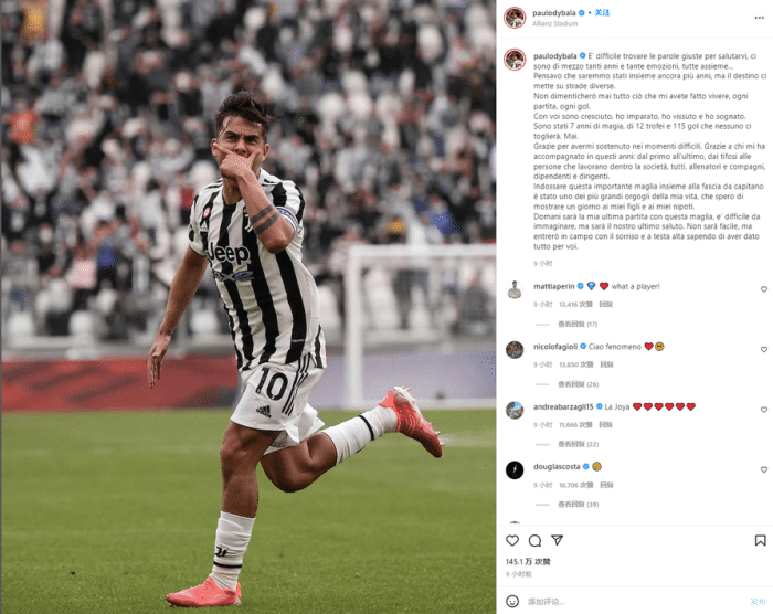 迪巴拉写道:“要道别了,但我很难找到合适的词语。这些年我们一起经历了很多风雨,共同经历了那么多情感,这一刻一切都交织在一起。”