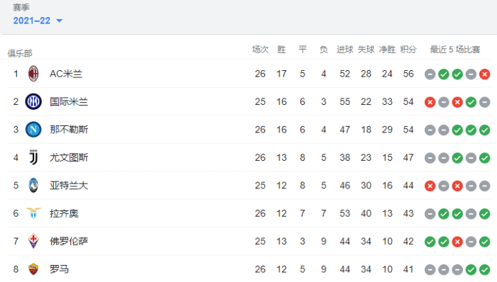 现在米兰26轮56分排第一,国米少赛一轮54分排第二,那不勒斯26轮54分第三,尤文26轮47第四,亚特兰大25轮44分第五,拉齐奥26轮43分第六。