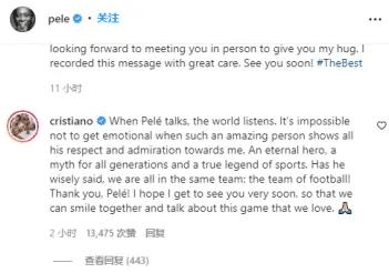 C罗也在评论区向贝利表达了感谢,他写道:“当贝利讲话的时候,全世界都会倾听。当这样一位传奇人物向我表示他的尊重和欣赏的时候,我感到非常激动。贝利是一个永远的英雄,一个世代相传的神话,一个真正的体育界传奇。他曾经说过,我们都处在同一个团队中:那就是足球队!谢谢贝利,我期待很快就能与你相见,这样我们就能一起笑着去谈论我们热爱的这项运动了。”
