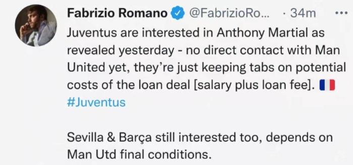 罗马诺:尤文有意马夏尔,目前还没和曼联直接接触
