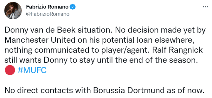 罗马诺表示,曼联没有对范德贝克的潜在租借交易做出任何决定,也没有向球员及其经纪人传达任何讯息,朗尼克希望范德贝克能够留队至赛季结束。