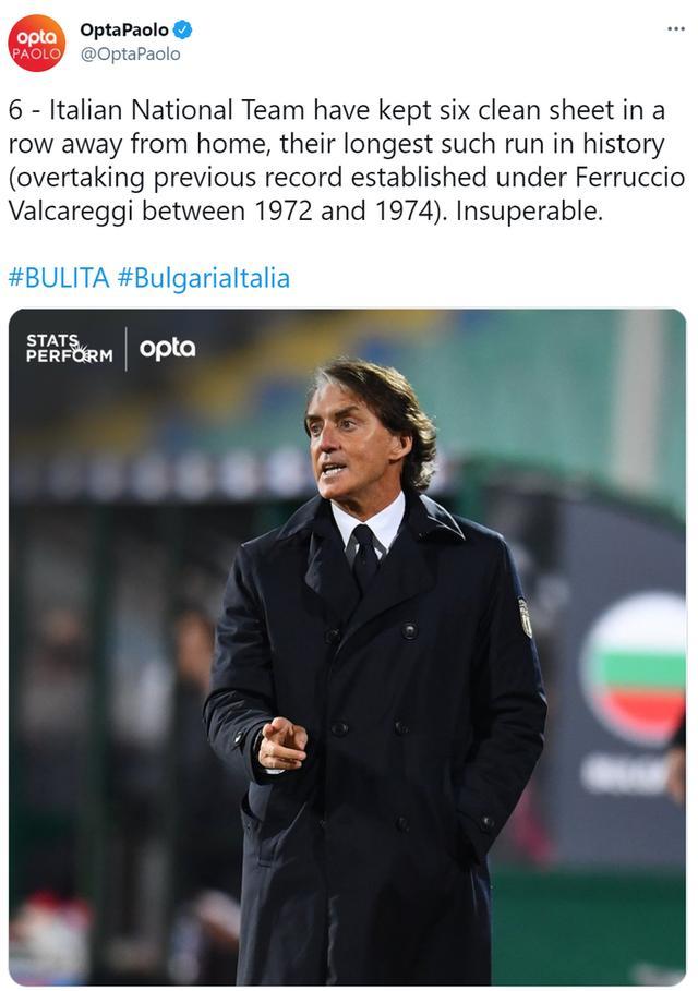 OPTA统计结果表明,这是意大利国家队历史上最长的客场连续零封纪录,在此之前,瓦尔卡雷吉在1972年至1974年间的连续5场客场零封为队史之最。
