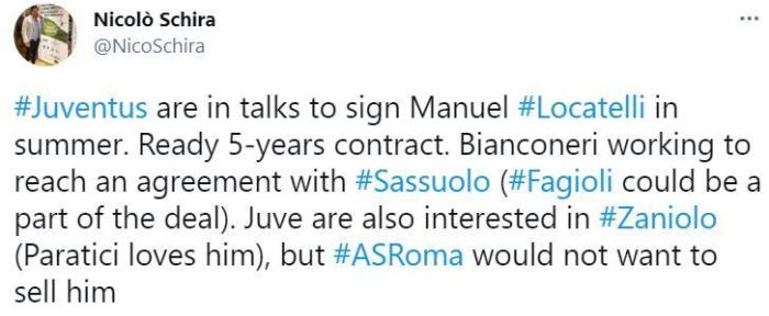 斯基拉此前曾表示,洛卡特利是尤文中场引援首选,萨索洛为其标价4000万欧元。