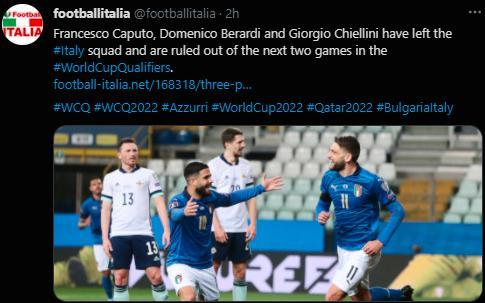 意媒:基耶利尼,贝拉尔迪和卡普托因伤退出国家队