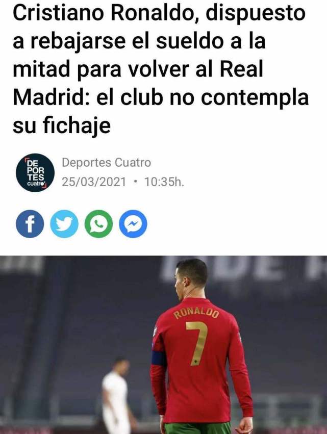 “cuatro”表示,C罗对于回归皇马非常热心。他甚至已经告知自己周围的人,他愿意为此做出经济方面的让步,只为能回归皇马。由于担心疫情致的经济危机会影响重返马德里的进展,罗总裁愿意降薪一半,只为说服皇马能够回购他。
