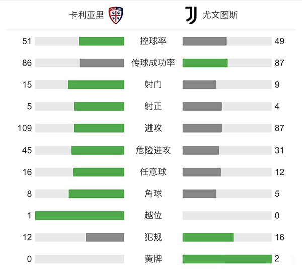 全场比赛结束,尤文图斯3-1卡利亚里。
