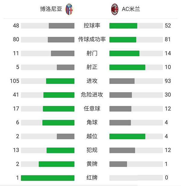 全场比赛结束,AC米兰客场2-1战胜博洛尼亚。