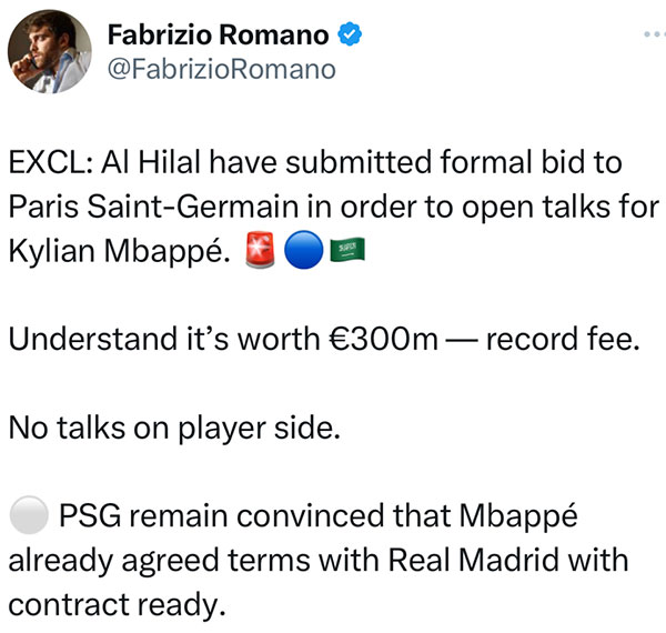 而法国权威媒体《队报》也证实了该消息,CBS记者James Benge则透露,利雅得新月除了向巴黎圣日耳曼提供3亿欧元的转会费之外,他们还准备为姆巴佩提供一年7亿欧元的薪资待遇,如果他愿意,一年后还可以自由选择是否离开加盟皇马。