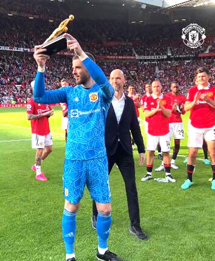 赛后,德赫亚从滕哈格手中接过「金手套奖」,并站在队友中间合影留念。虽然德赫亚赛季中出现过几次失误,但主教练认为他进步更大,是球队整体提升的缩影。