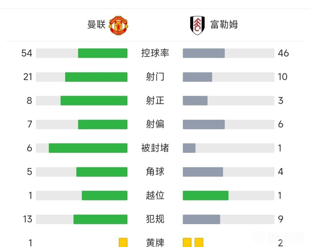 最终全场比赛结束,曼联2-1战胜富勒姆。