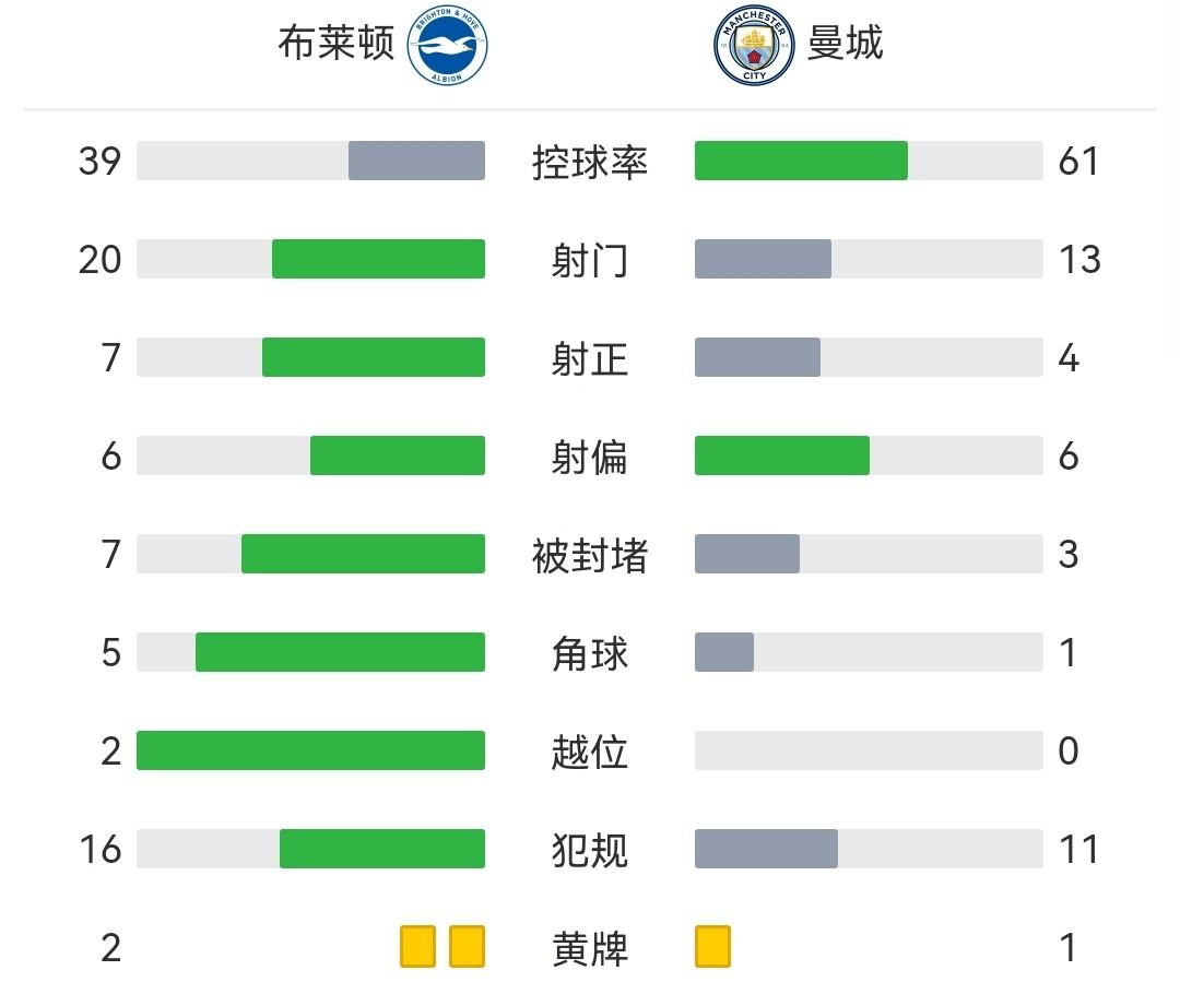 最终全场比赛结束,曼城客场1-1布莱顿。