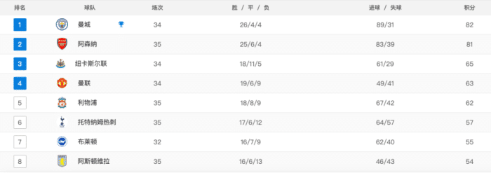 来源:24直播网05-08 11:4724直播网05月08日,英超联赛第35轮结束了两场焦点战角逐。最终曼联客场0-1输给西汉姆联,而纽卡斯尔则主场0-2被阿森纳终结了3连胜的步伐。在纽卡和曼联先后输球后,本赛季英超争四悬念重新燃起。