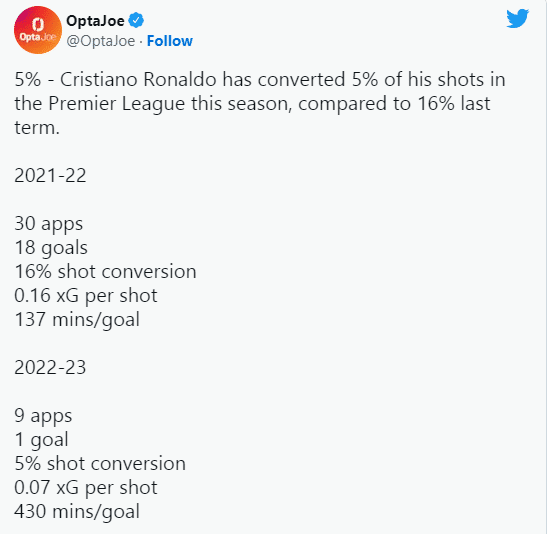OPTA统计,本赛季他在英超只有5%的射门转化为进球,每430分钟才进一球。上赛季他30场英超打进18球,射门转化率16%,每137分钟进1球。