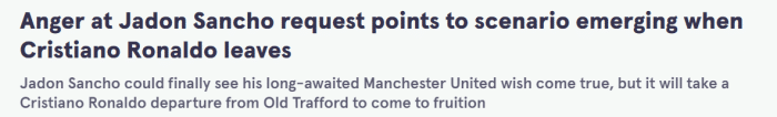 37岁的C罗最早可能在1月份的冬季转会窗离开,而桑乔渴望曼联兑现承诺。因为俱乐部在2020年第一次与他进行转会谈判时,就曾答应给他7号。桑乔和他的团队觉得,这是曼联俱乐部欠他的(feels like United owe it to him)。