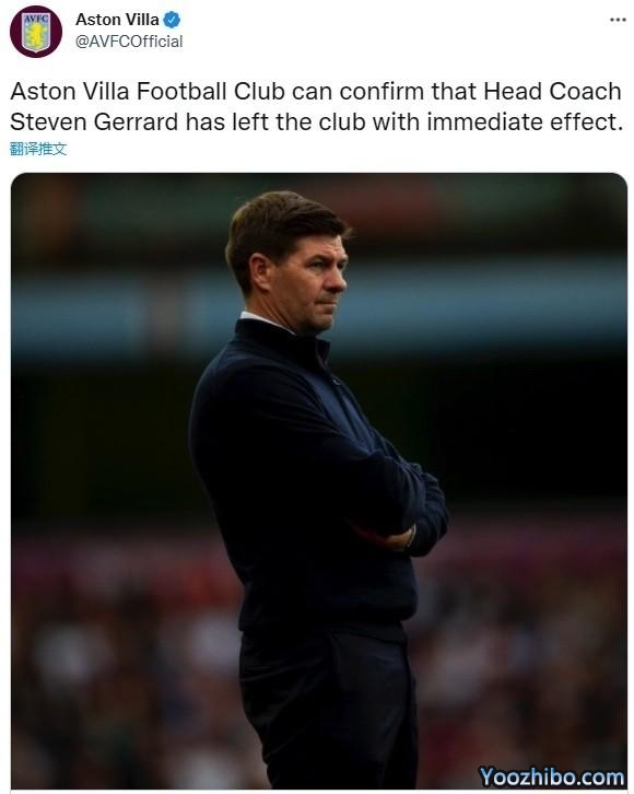 维拉官宣42岁杰拉德下课!11轮仅9分排名倒4濒临降级