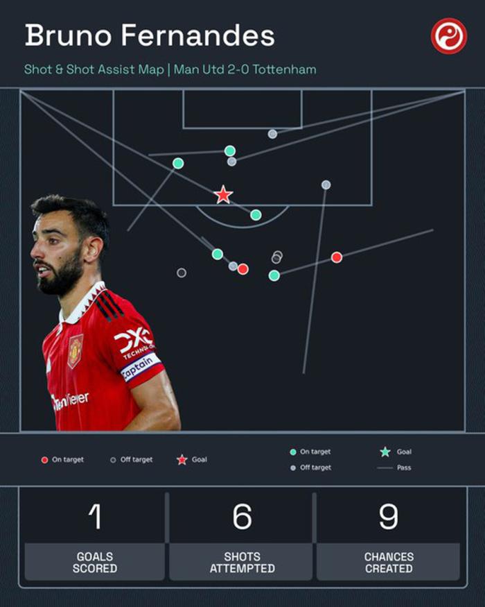 数据显示,本场B费创造9次机会,这一数据刷新本赛季英超球员单场创造射门机会次数之最,也是2021年9月B费本人在对阿斯顿维拉之战创造10次机会之后,英超该项数据的最高值。事实上,B费一个人创造的机会次数,就与热刺全队相同。