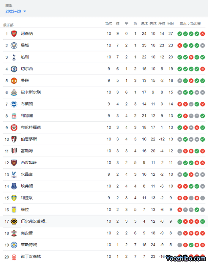 曼城在输球后继续排名第二,10轮23分与热刺同分,切尔西击败维拉后则9轮19分排名第四。