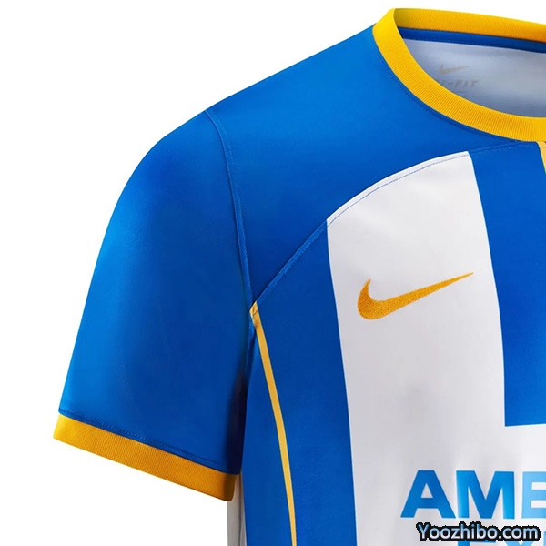 布莱顿2022/23赛季主场球衣搭配白色球裤与球袜。球衣使用由100%再生聚酯纤维面料打造,同时还搭载耐克知名的Dri-FIT球衣科技,在贯彻可持续发展的环保理念的同时提供舒适干爽的穿着体验。