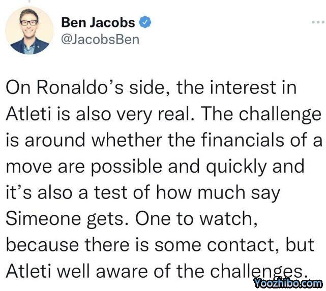 北京时间7月19日,来自CBS记者Ben Jacobs的透露,尽管曼联方面坚持C罗是非卖品,但如果有具体实际的报价,红魔的立场将会面临考验。而C罗对转会马竞是开放的,很重要的原因便是马竞有下个赛季的欧冠门票,并且在西甲保有争冠的实力。