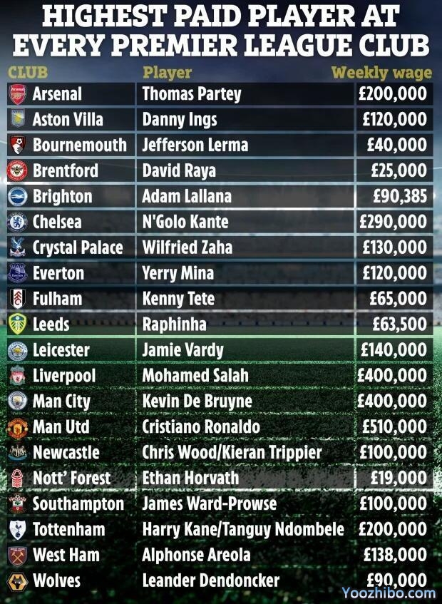 注:在《邮报》统计中,C罗和德布劳内的薪水为38.5万镑