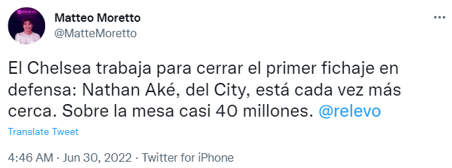 24直播网06月30日讯 Relevo记者马特奥-莫雷托报道,切尔西为曼城后卫阿克报价4000万欧元,已接近签下他。