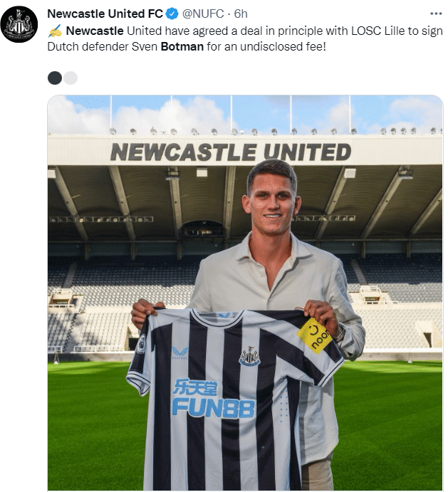 24直播网06月29日讯据纽卡斯尔官方消息,俱乐部已签下里尔后卫博特曼,喜鹊官方未透露球员转会费,但根据此前报道,博特曼的交易费用为3700万欧元+浮动。