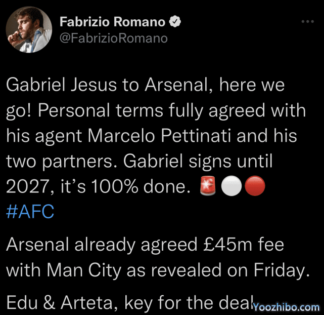 来源:24直播网06-27 18:1324直播网06月27日讯 日凌晨,知名转会专家罗马诺在个人社交账号上确认,巴西射手热苏斯的经纪人已经与阿森纳俱乐部达成协议。双方将签约5年至2027年。而热苏斯也将成为继马尔基尼奥斯和法比奥-维埃拉之后,阿森纳夏窗的第三位新援。