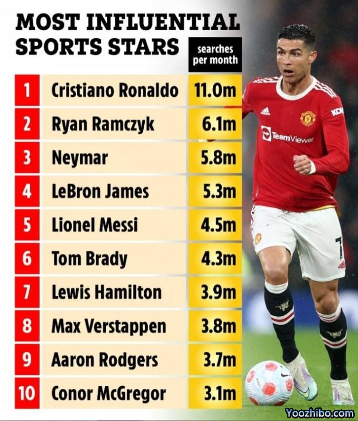 24直播网06月25日讯 据《太阳报》消息,C罗成为全球搜索量最高的体育明星,平均每月被搜索1100万次。