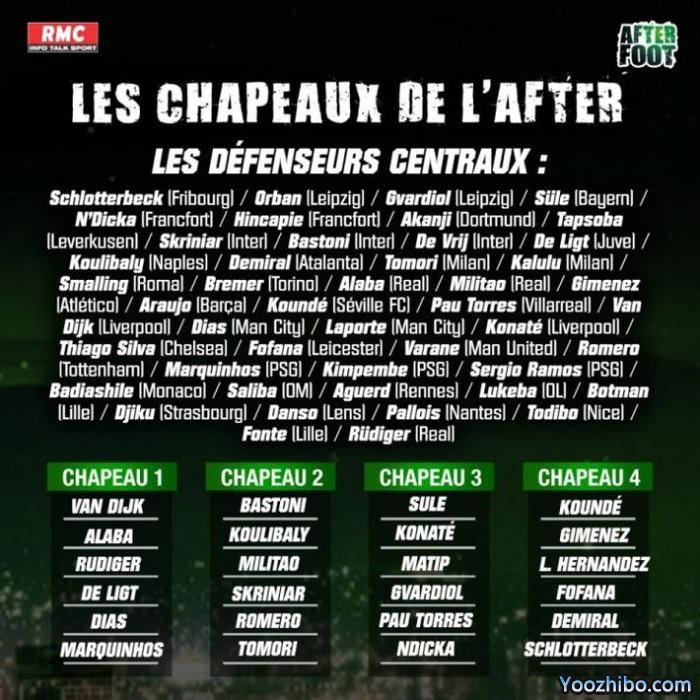 一档:范迪克(利物浦)、阿拉巴(皇马)、吕迪格(皇马)、德里赫特(尤文)、鲁本-迪亚斯(曼城)、马尔基尼奥斯(巴黎)
