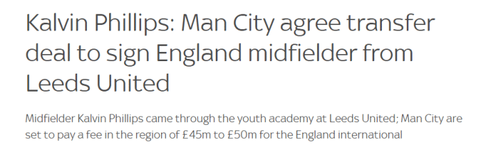 天空体育称菲利普斯的转会费在4500万到5000万英镑之间。他已经和曼城谈妥个人待遇,通过曼城体检后将加盟。罗马诺称其转会费为4200万+500万奖金。