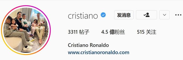 除了ins的粉丝,C罗在推特、脸书的粉丝数也已超过一亿。