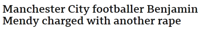 24直播网06月02日讯 据BBC报道,曼城后卫本杰明-门迪被指控犯有另一项强奸罪,现在他被指控对7名女性实施8次强奸、1次性侵和1次强奸未遂。