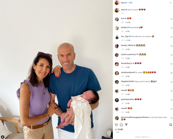 24直播网06月01日讯 齐达内的儿子恩佐日前在Instagram上晒出父亲抱着孙女的照片,证实齐达内已经当爷爷了。