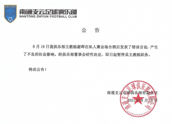 谢晖酒后的口嗨确实带来了不好的影响,但是对于一名足球教练来说,他还是很重要的,所以也期待谢晖可以早日重返岗位,恢复自己南通支云主帅的身份,带领球队继续前进。