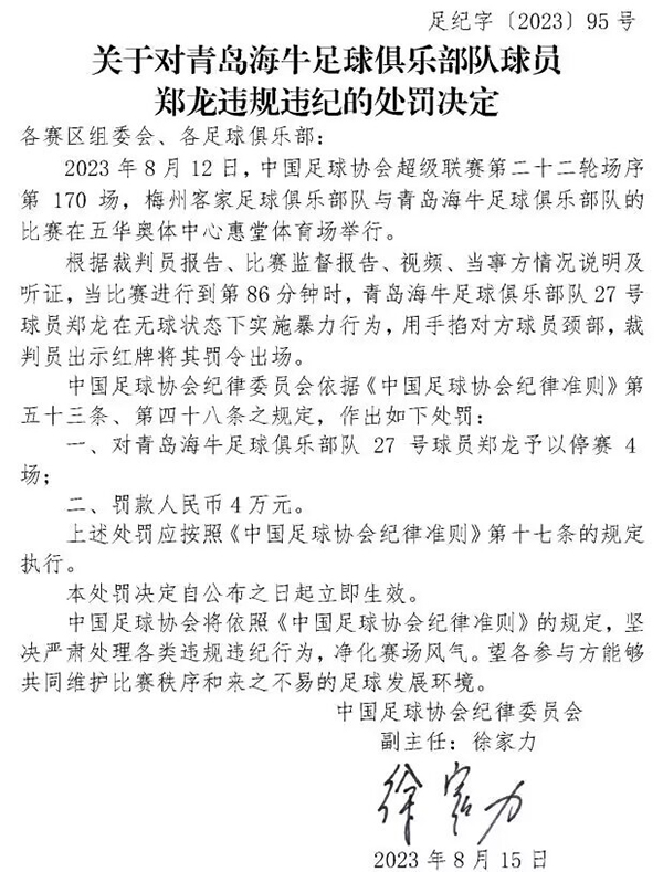 来源:24直播网08-16 17:1324直播网08月16日讯,中国足协再次开出重磅罚单,效力于中超升班马青岛海牛队的35岁前国脚郑龙,因为锁喉推倒对手外援,被停赛4场并且罚款4万元。